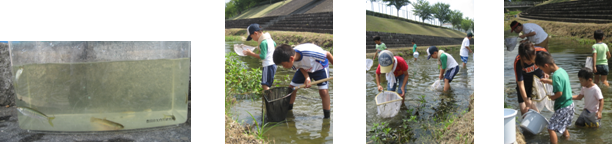 親子で水無瀬川の川しらべを実施しました。日ごろ住民の皆さんに親しみのある水無瀬川にどんな魚がすんでいるのか、どんな生き物がいるのか、水はきれいなのかなどを調べました。住宅地を流れる川ですが、ドジョウ、メダカ、モツゴ、オイカワ、フナ、エビ、ヤゴなどを採取できました。(2010年度~)